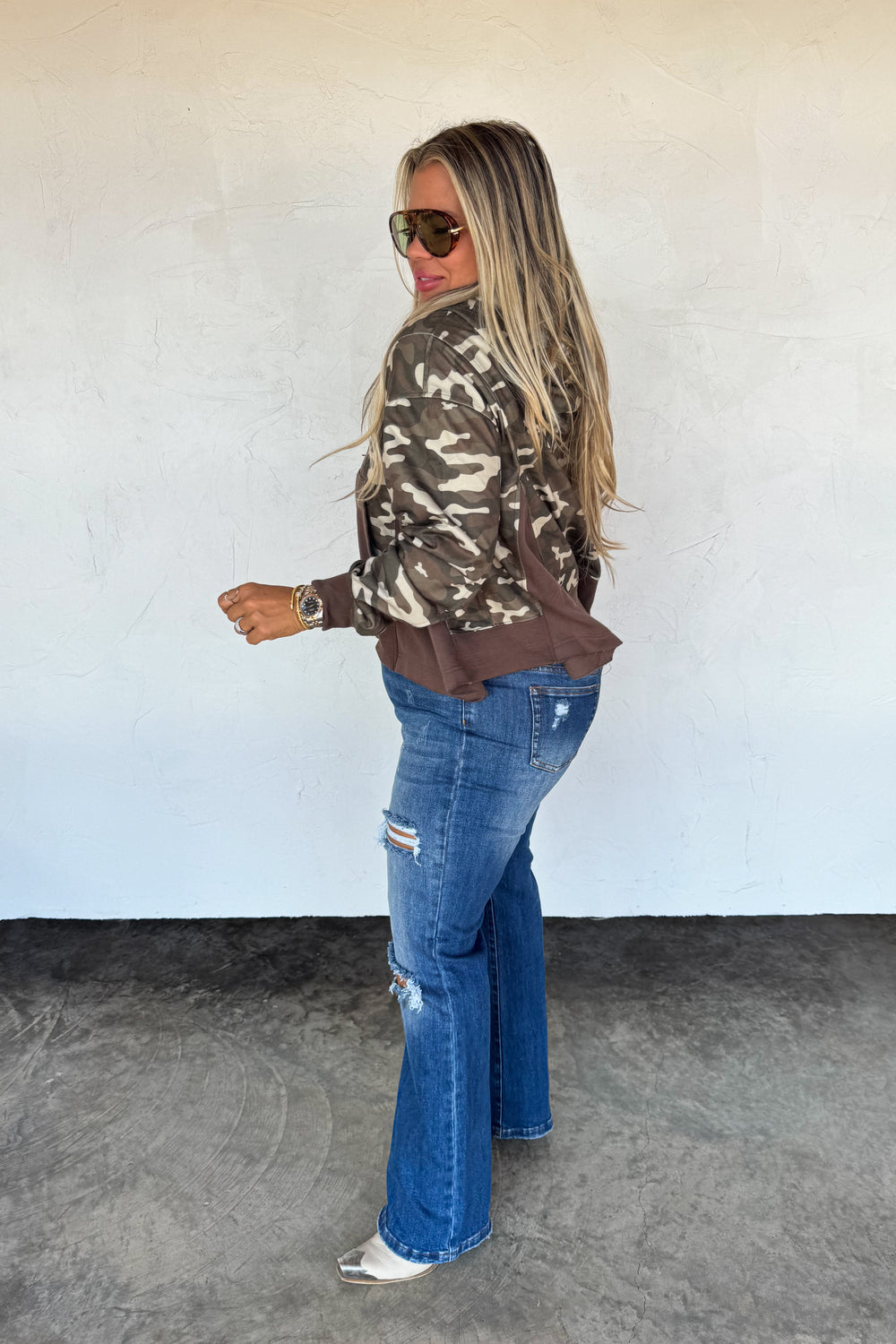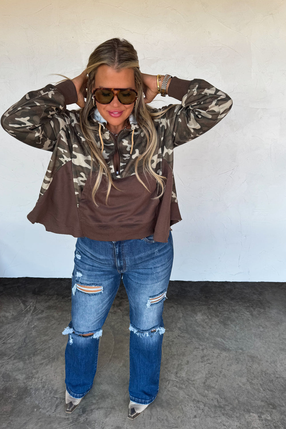 This half-zip hoodie pullover features a relaxed, swing-style fit. With a super soft texture, roomy hood, kangaroo pockets, and an easy half-zip neckline, it’s the perfect throw-on layer for effortless everyday style
