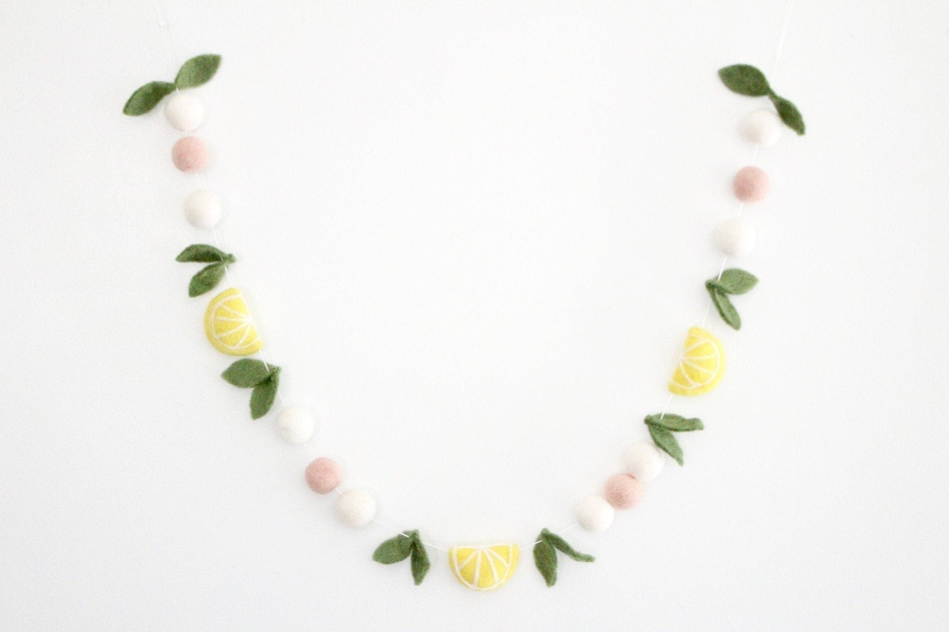 This lemon garland features three felted lemons, green leaves, and blush and white felt balls. No customizations in length or color changes are available for this garland as they are ready-to-ship.